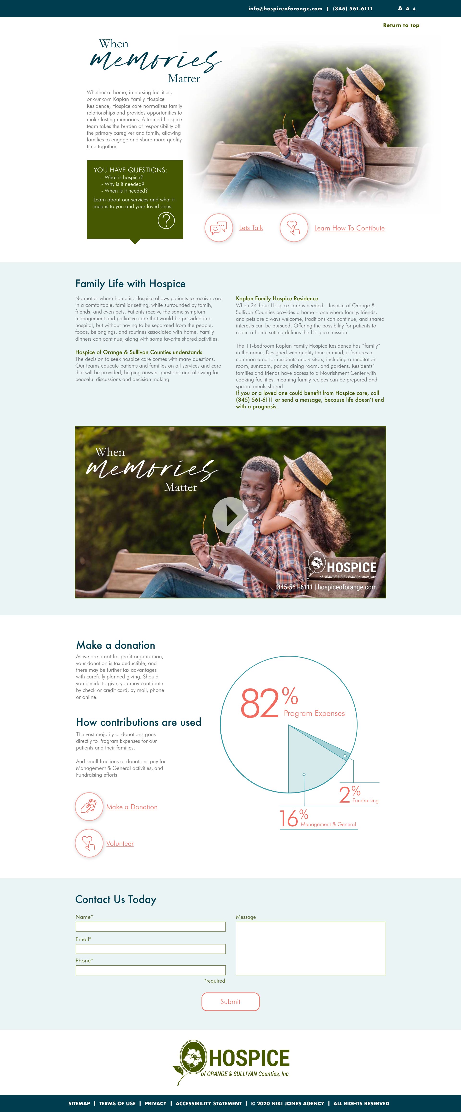 The first of these campaigns was titled “When Memories Matter.” Rather than focus on symptom management services, we focused on hospice’s emotional and spiritual benefits to patients and their loved ones, highlighting opportunities for continuation of family traditions and making new memories, as well as resources for spiritual support and grief counseling. Each campaign featured video testimonials from family members of hospice patients.